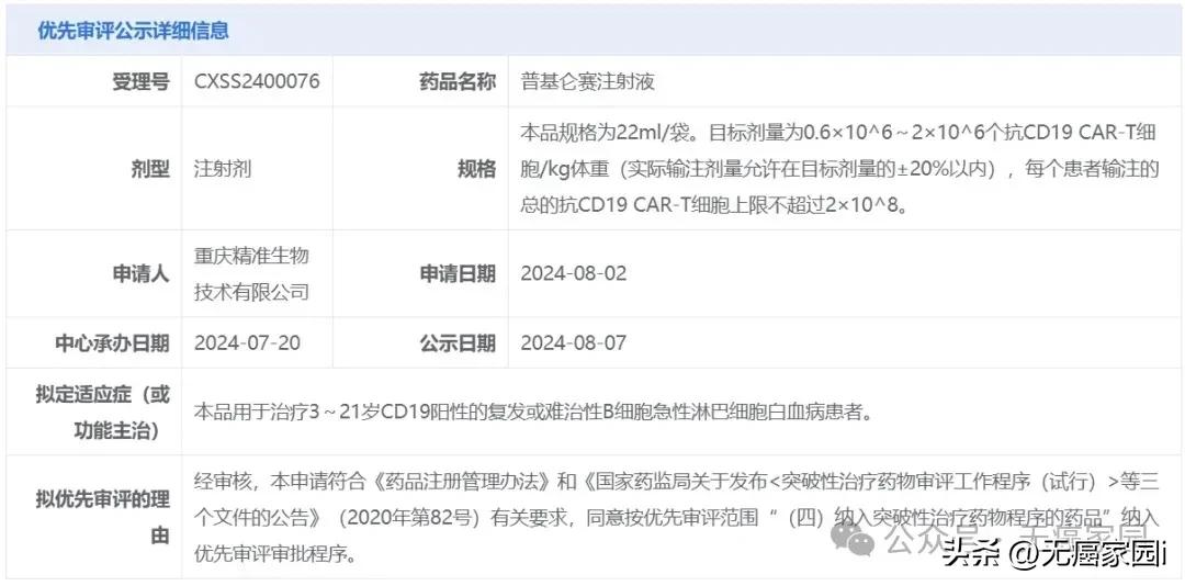 2024年8月7日,中国国家药监局药品审评中心(CDE)官网公示,普基仑赛注射液(pCAR-19B细胞自体回输制剂)新药上市申请拟纳入优先审评,适应症为治疗3~21岁CD19阳性的复发或难治性B细胞急性淋巴细胞白血病患者。