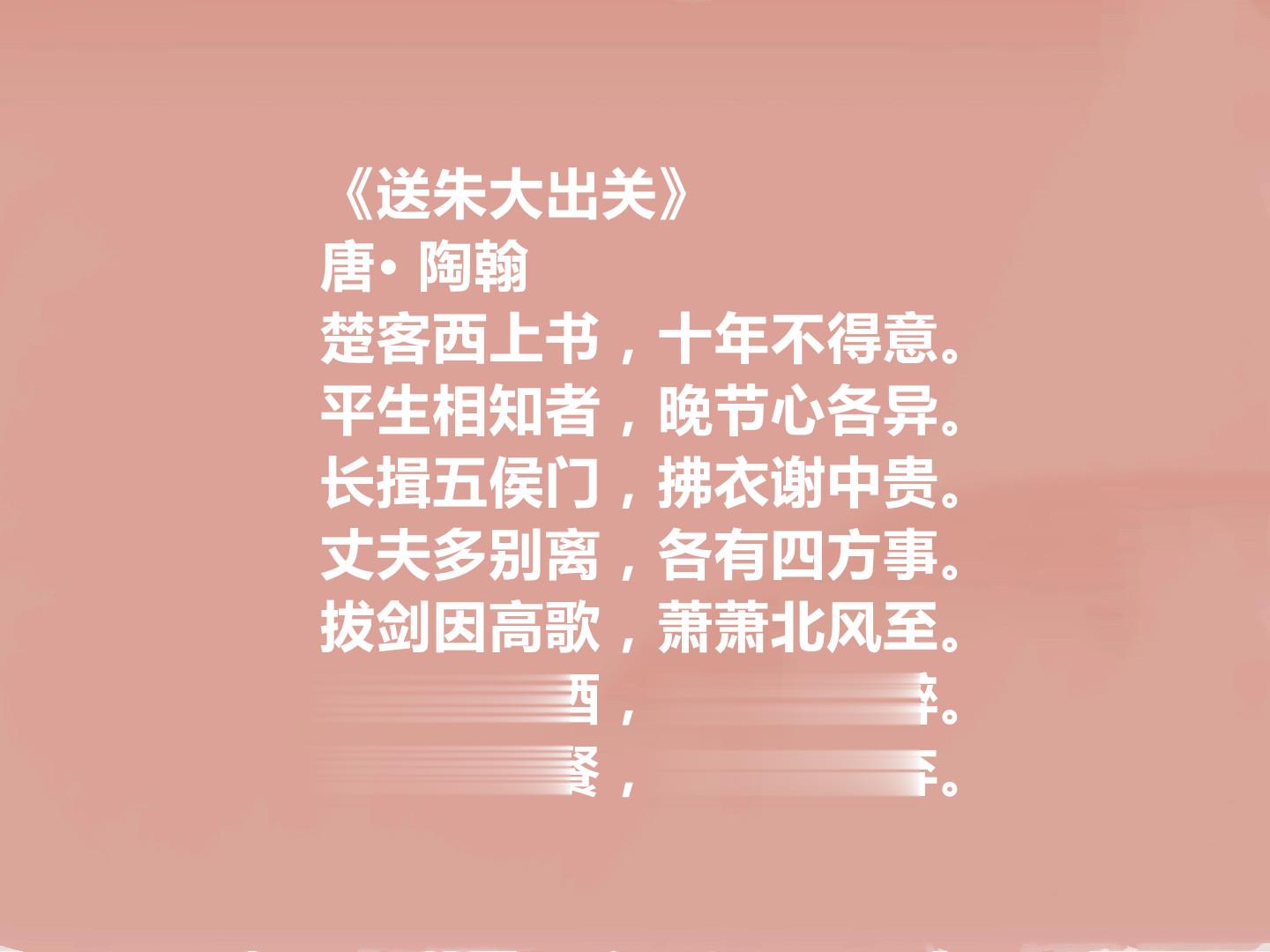 陶翰出身润州丹阳官宦世家,家庭底蕴深厚,自幼接受正统儒家教育,熟读六经、精通诗赋,良好的家学渊源为他日后的文学创作与仕途发展奠定了坚实基础,培养了他正直端方、心怀家国的品格。他并非隐居避世的文人,而是积极入仕、仕途平稳的盛唐官吏,开元十八年进士及第后,接连登博学宏词、拔萃二科,授华阴丞一职,开启仕途;天宝年间入朝历任大理评事、太常博士,最终官至礼部员外郎,属于朝廷中层清要官职,负责礼仪、文教相关事务,深得朝廷认可。