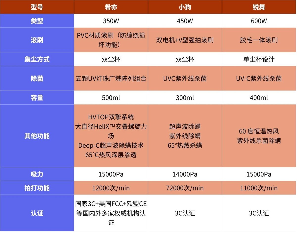 综合噪音方面的实测,在噪音分贝方面,希亦RM1除螨仪表现最优秀,为用户提供了安静舒适的使用体验;小狗除螨仪噪音处于中等水平,基本能满足日常使用;锐舞除螨仪噪音较高。