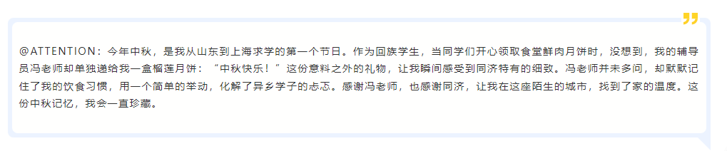 有回族学生刚到上海的第一个中秋,当同学们开心地领取食堂的鲜肉月饼时,辅导员单独递给她一盒榴莲月饼,什么都没问,却默默记住了她的饮食习惯;