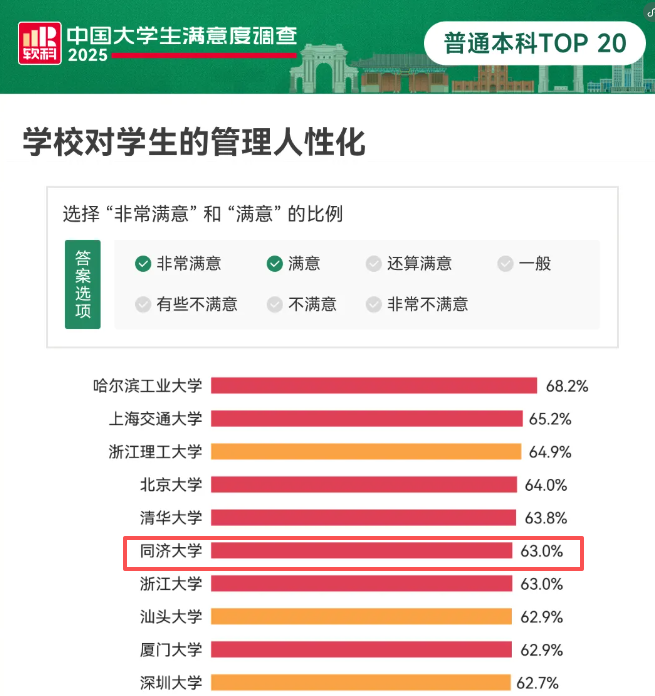 这份温暖从来不是个例,而是刻在同济校园管理里的常态。也难怪在最近的院校满意度调查中,同济大学在“学校对学生的管理人性化”维度,以63.0%的满意 + 非常满意占比,位居第六。能被学生实实在在认可,足以见得同济的温暖,从来不是喊口号,而是落到实处的用心。