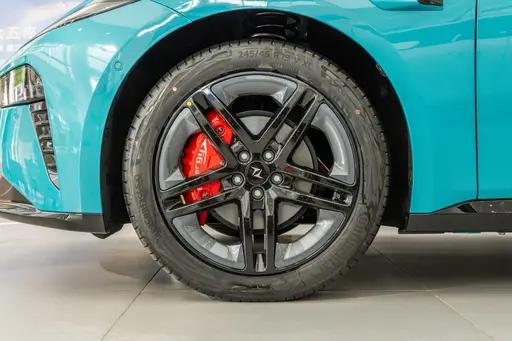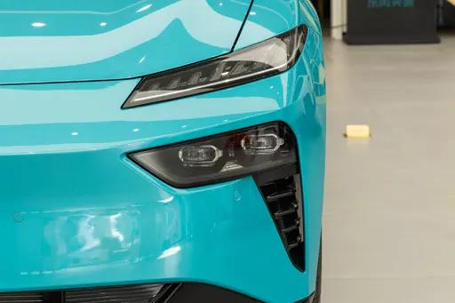先说外观吧,毕竟外观对大部分购车决策来说,往往是第一道“门槛”。eπ007+用的其实是延续老款的设计思路,最大变化在于加入了全新车顶激光雷达——这玩意儿以前只在三四十万的智能车上能看到。加上全新双色双五辐轮辋、标准配红色刹车卡钳,车身运动感一下就立住了。走近看,这轮毂造型比老款锐利不少,侧面配合溜背车顶,车身整体运动、低趴,给人感觉很有精气神。还有细节,比如后视镜和尾灯上带的小蓝灯,说实话,白天不太显眼,但晚上辅助驾驶提示时真的很明显,变道、转弯、提示功能都非常直观,对夜间行车安全有加分。