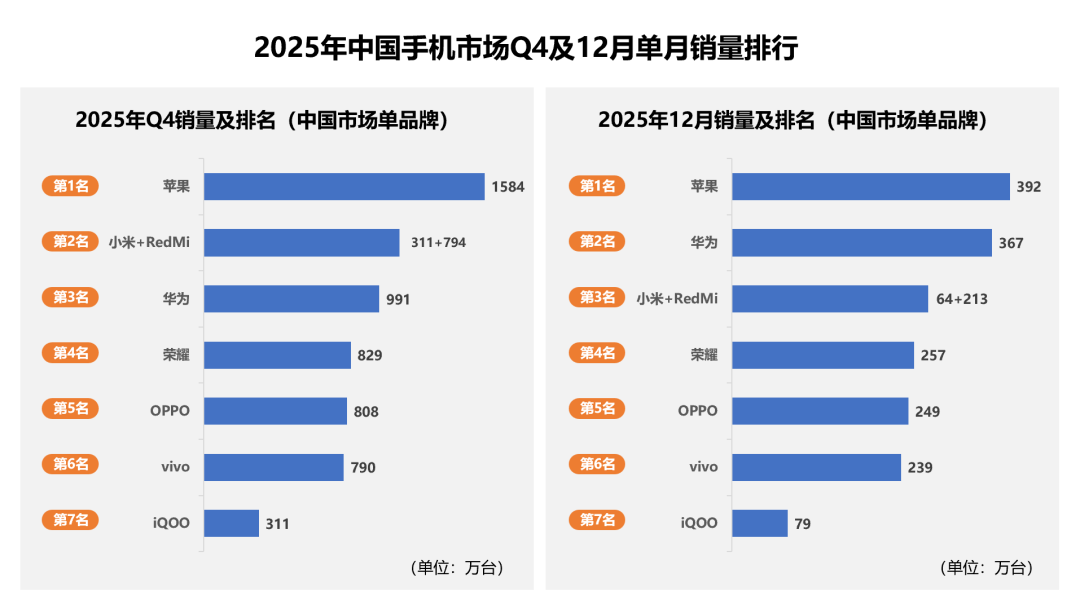 在这样的市场环境下,荣耀的2025年呈现出一组颇具张力的数据:如果把小米+RedMI作为一个品牌来看,荣耀无论是Q4还是12月均排名第四,而荣耀海外的销量增长了47%,占比首次突破50%,全年手机发货量突破7100万台,同比增长9%。