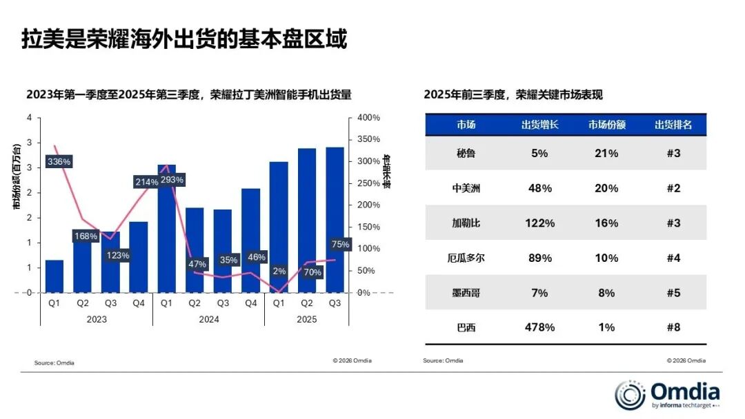 2025年前三季度,荣耀海外智能手机出货量同比增长约55%,增速位列全球前十大智能手机厂商首位。全年来看,海外销量增长47%,占比首次超过50%,拉美和中东非地区出货量均突破千万台,17个重点国家市场份额超过10%。