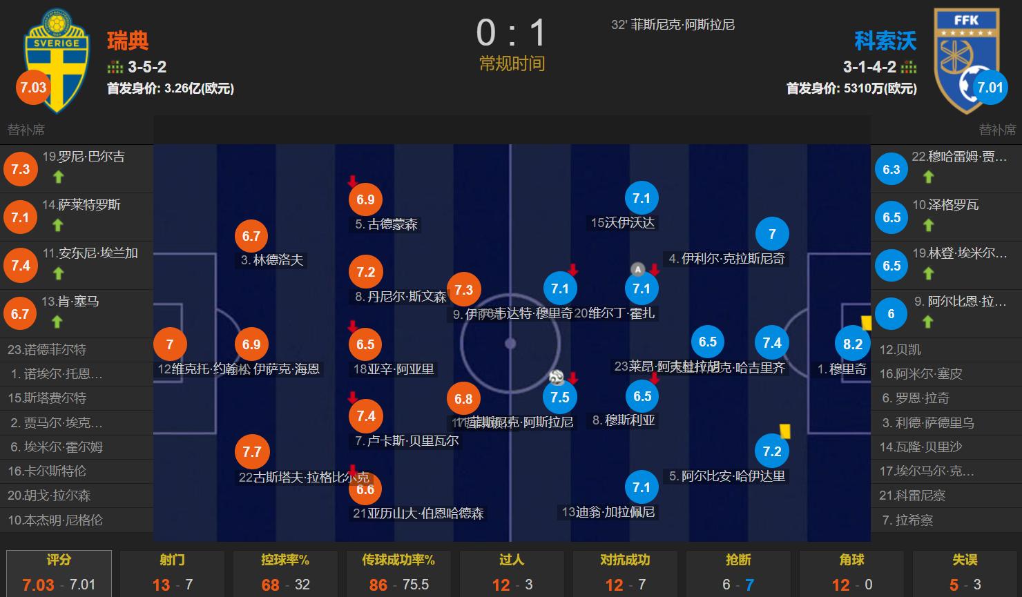 北京时间10月14日凌晨02:45,世预赛欧洲区小组赛B组第4轮,世界排名第32位、总身价4.6亿欧元的瑞典主场0-1不敌世界排名第91位、总身价1.07亿欧元的科索沃,遭遇世预赛小组赛4轮不胜,3负1平仅得1分,近3轮世预赛0进球,已经确定无缘小组头名,也意味着确定无缘直接2026年美加墨世界杯。