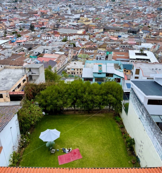 这张作品以俯视的视角既表现出了城市的特征,也凸显出的恬淡的生活气息。