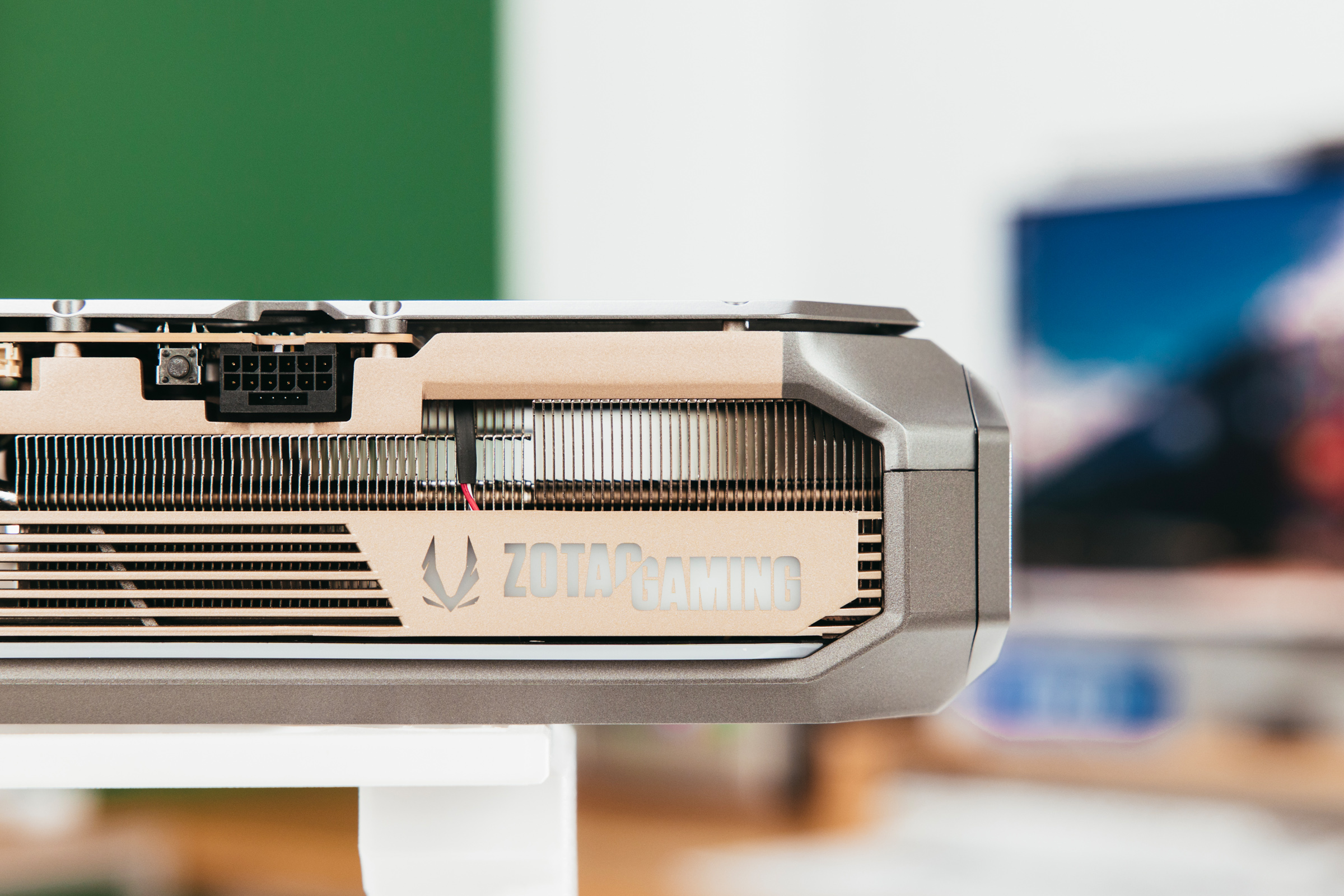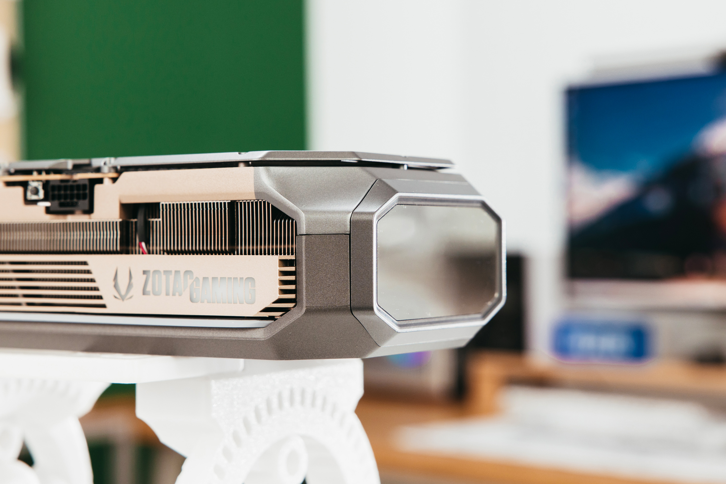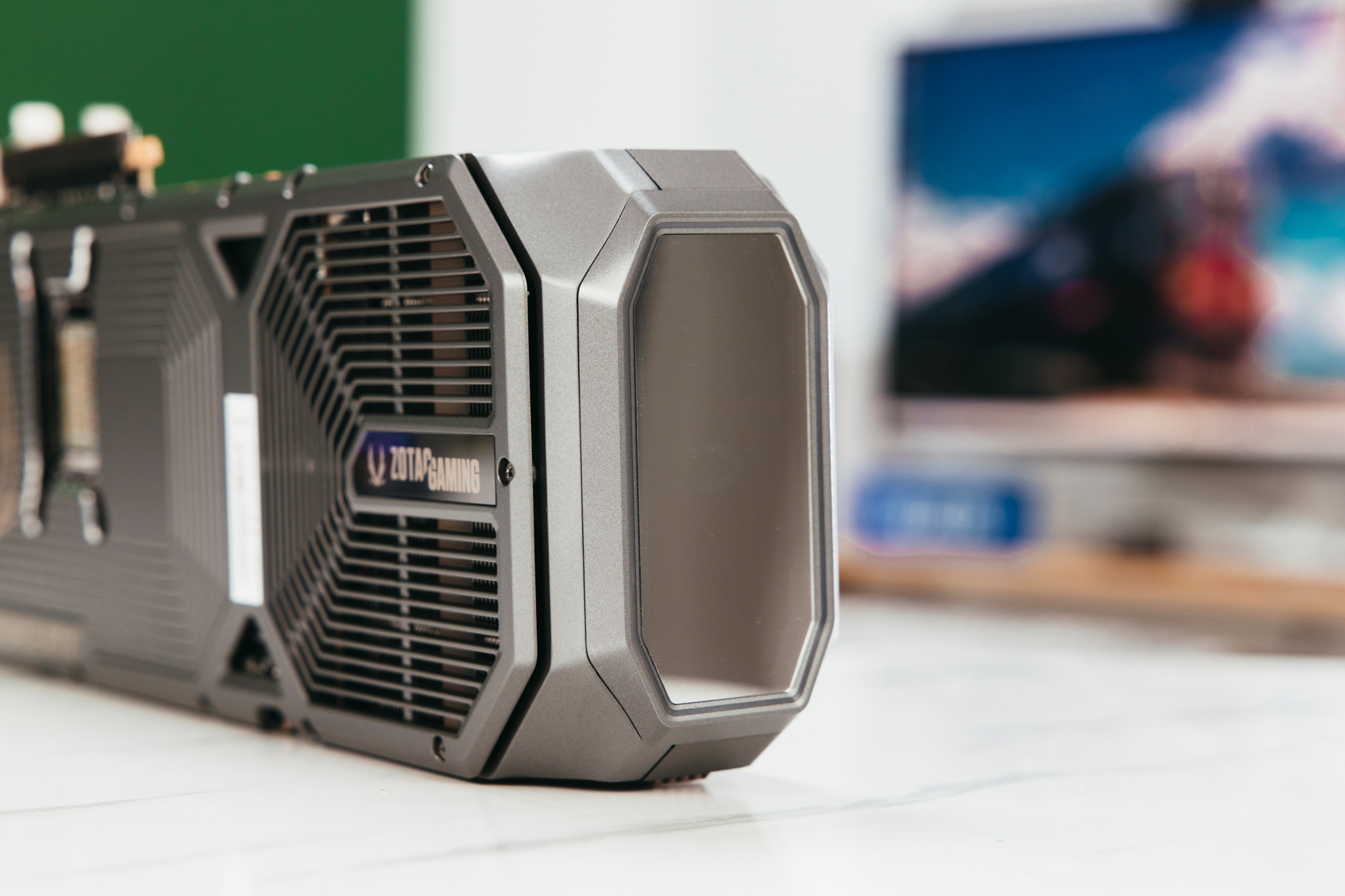 索泰5080 AMP EXTREME INFINITY正面细节特写,无光,但是顶部有灯带。