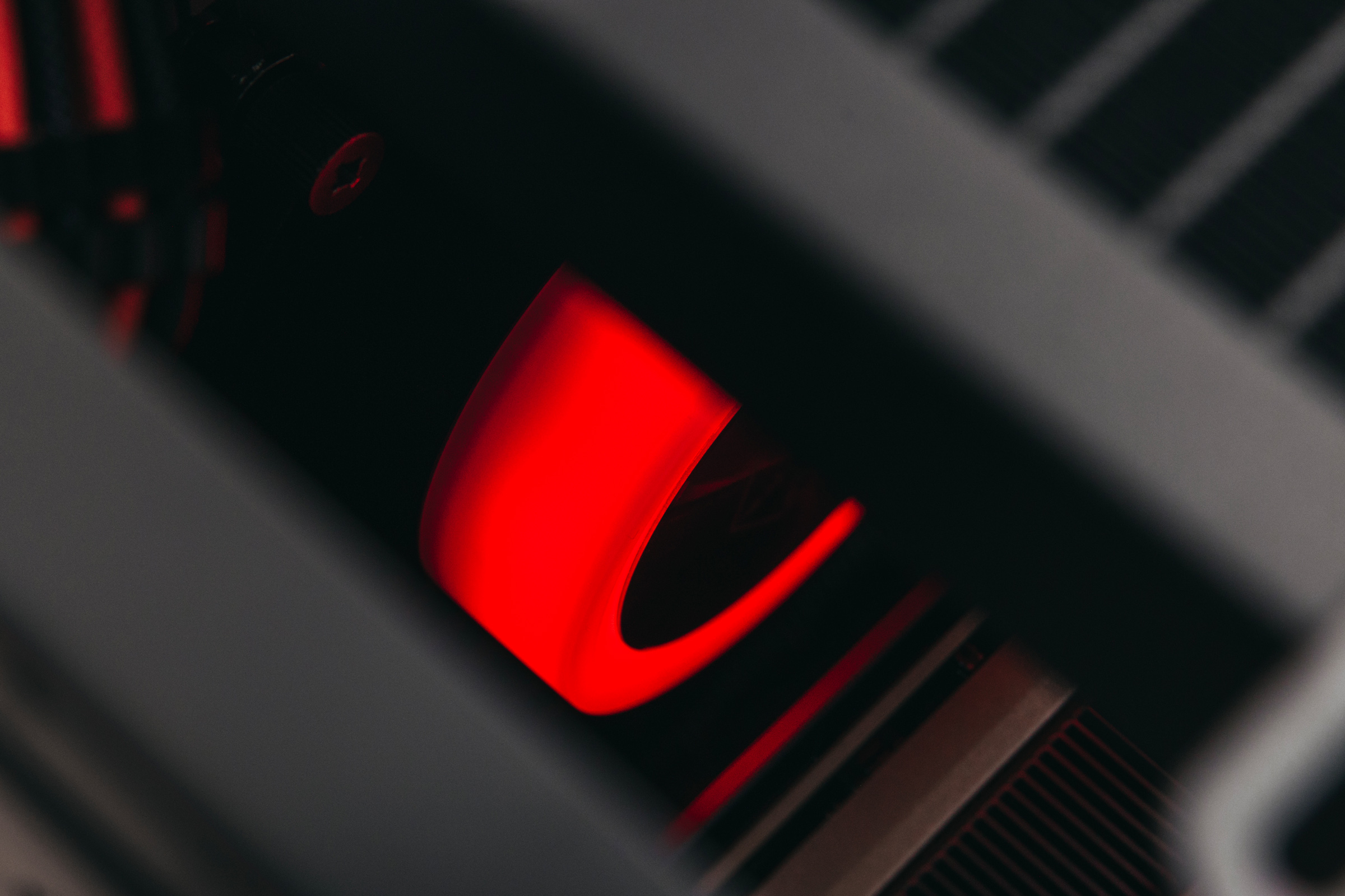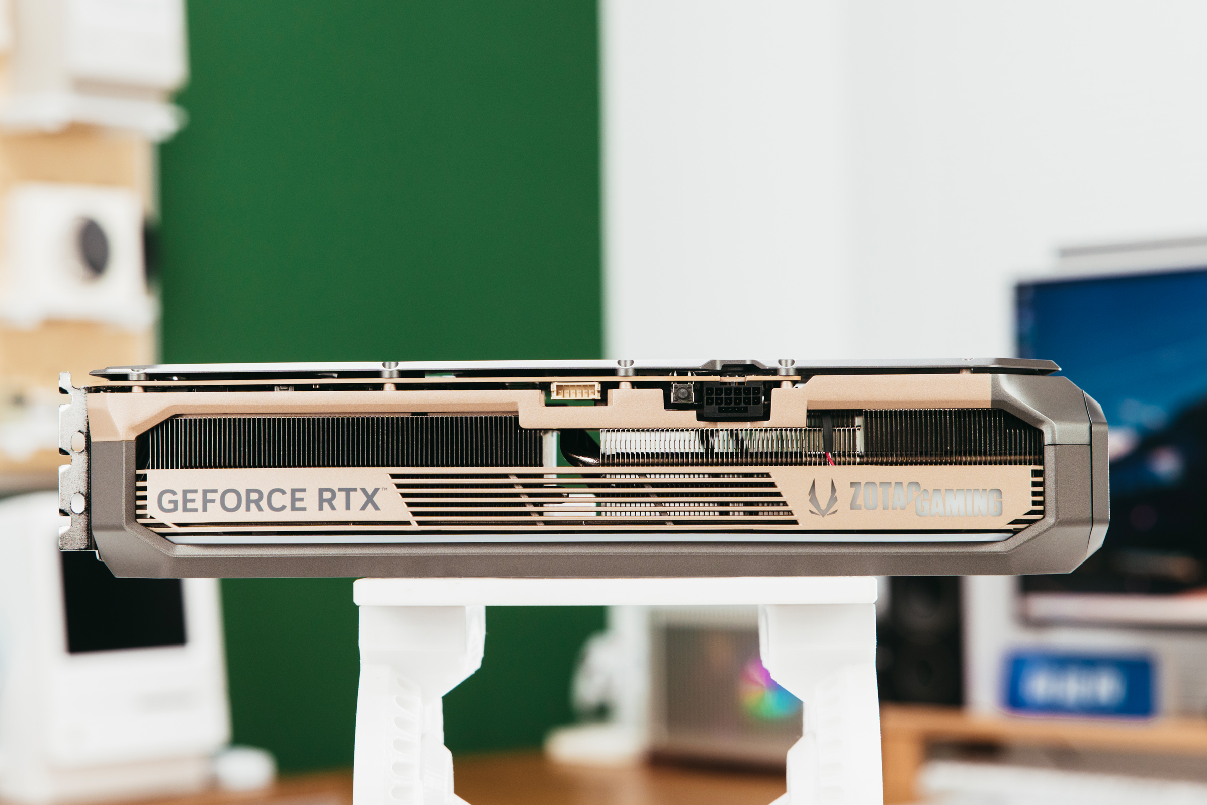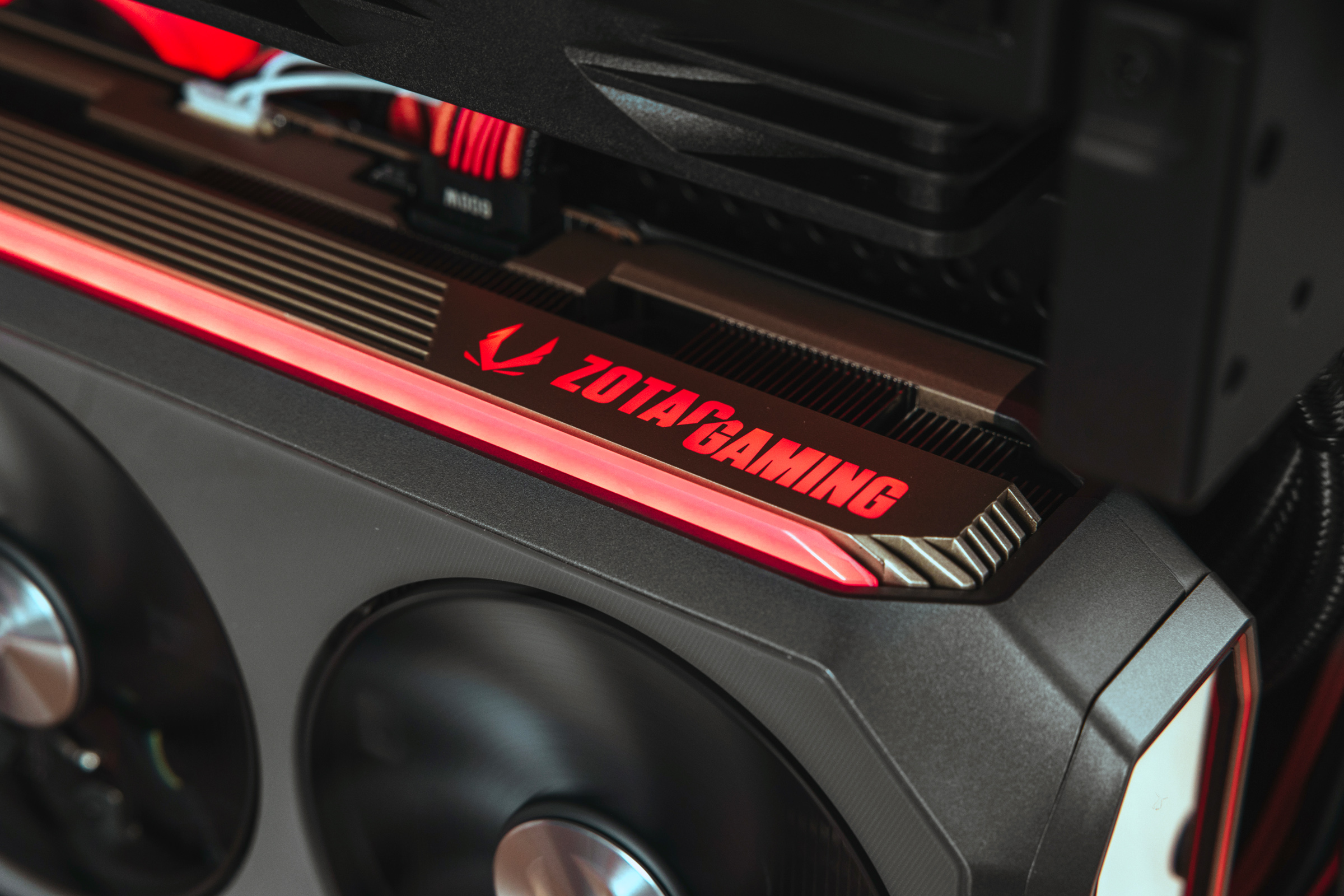索泰5080 AMP EXTREME INFINITY正面细节特写,无光,但是顶部有灯带。