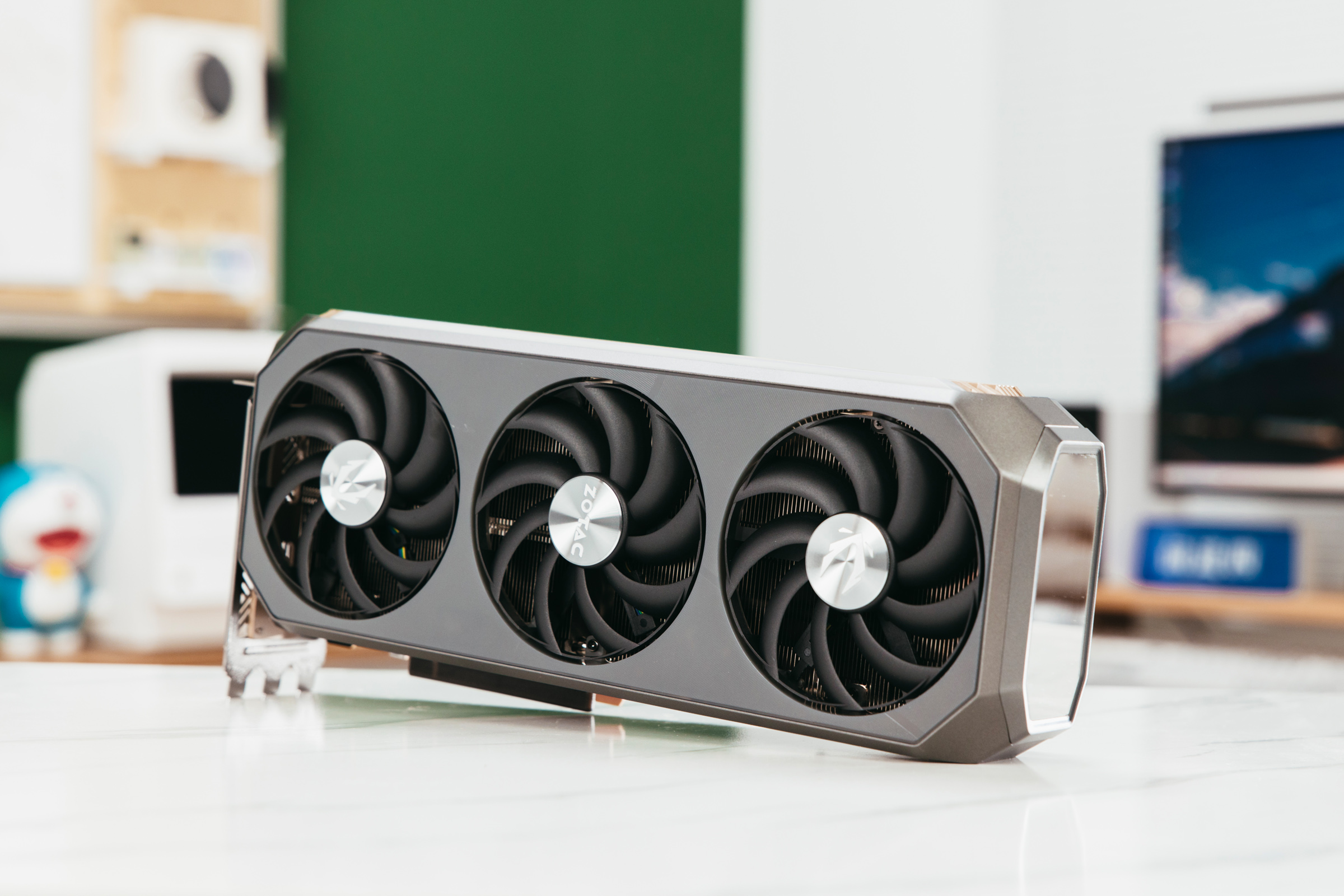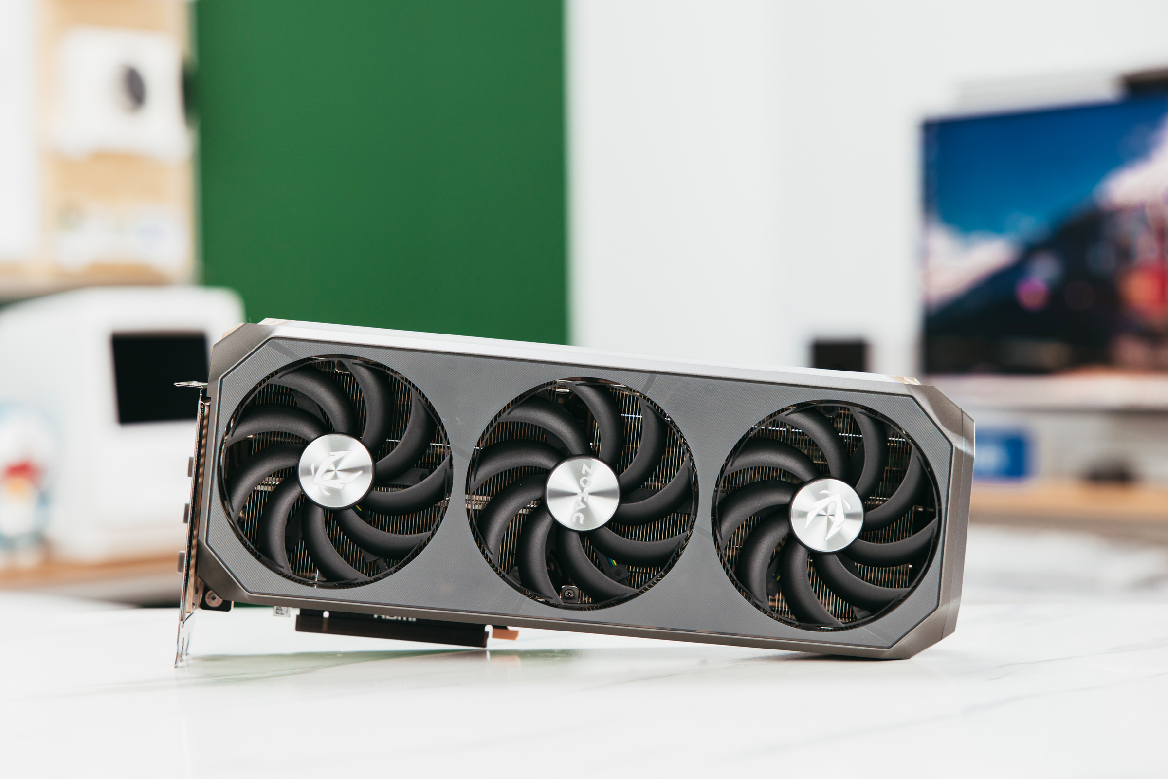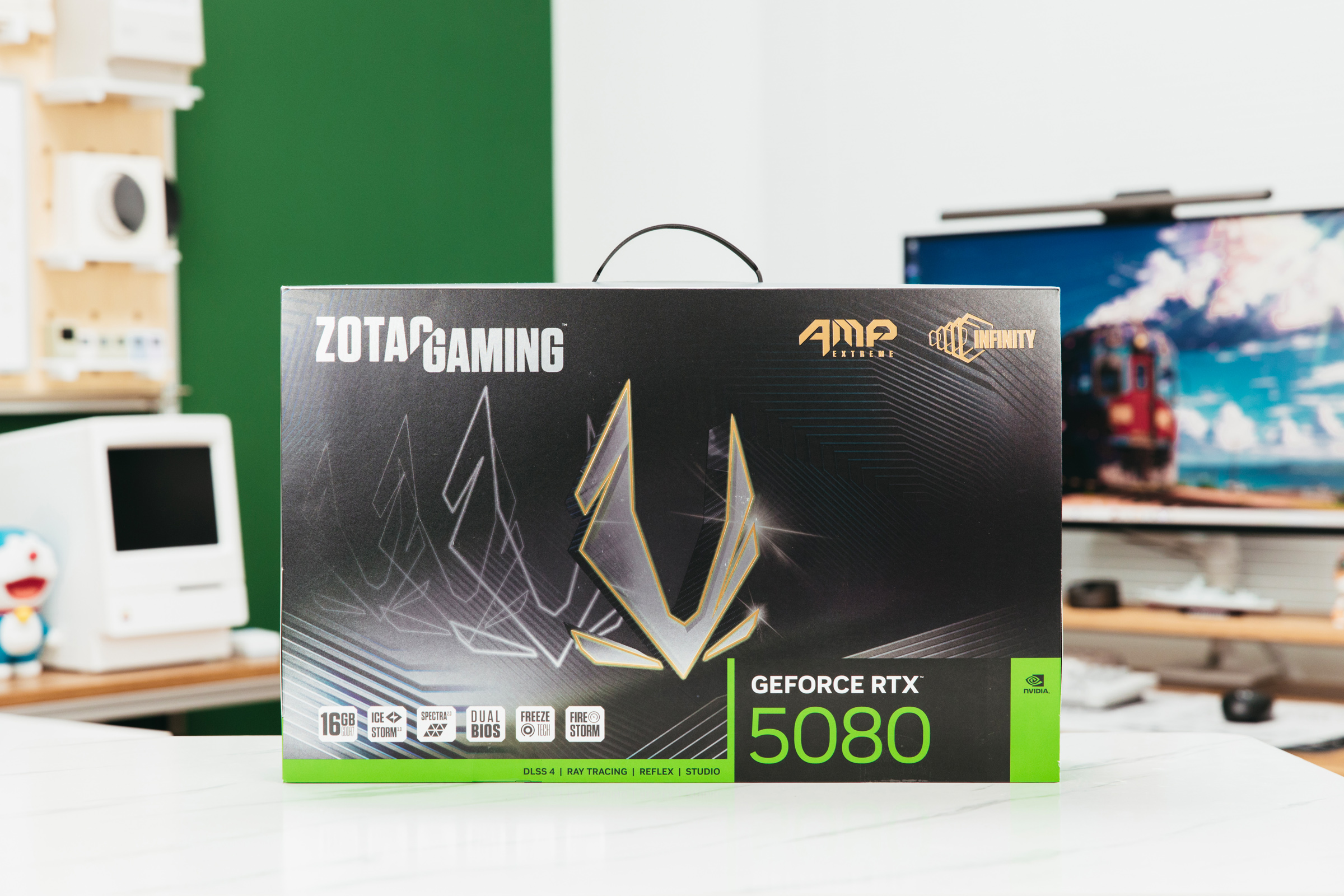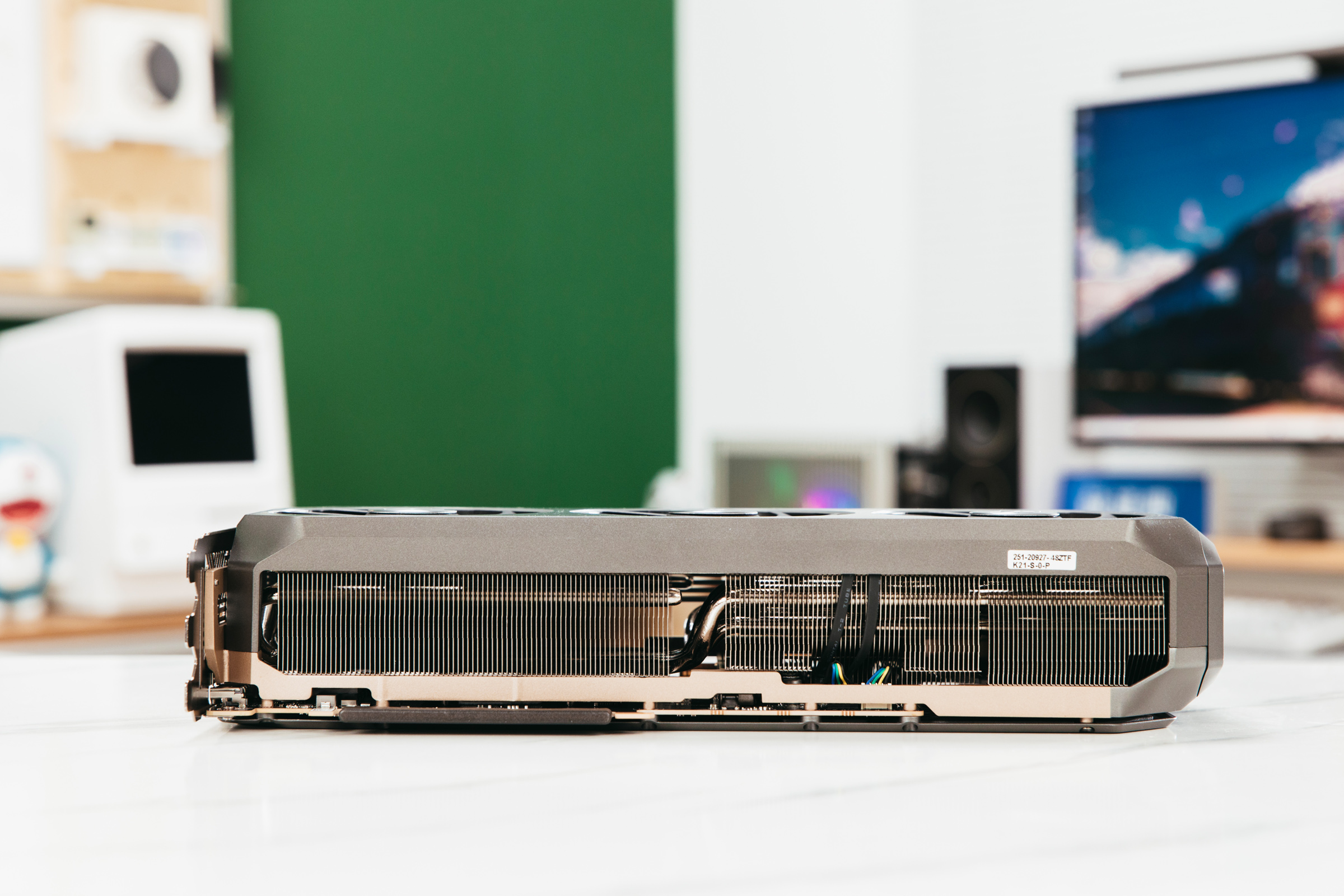 这张索泰5080 AMP EXTREME INFINITY基准色调其实偏灰黑,在光线很好的场景下会接近灰色,在光线不足的情况下则是接近黑色,用来搭配黑色或者银色机箱都是没有太大问题的。
