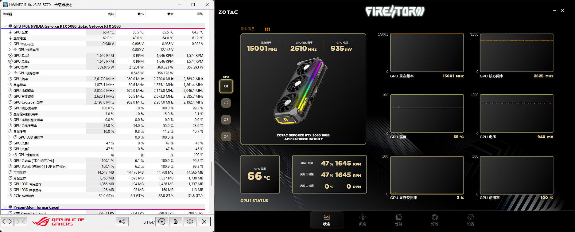 对显卡做一个FurMark单拷测试,功耗拉满360W的场景下, BIOS设置为全速模式,15分钟单拷平均温度仅有65度,显卡核心频率维持在2625Mhz,风扇转速仅有47%,可以说散热系统还没发力。