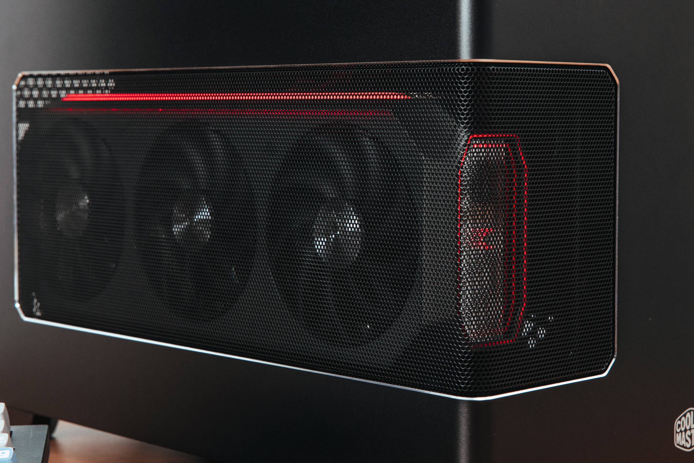 无限棱镜特写,建议这块显卡搭配能很好的展示无线棱镜的海景房机箱,像是本次装机用的酷冷至尊NR200P V3,刚好开了L型的窗口,也能很好的展示这块无限棱镜效果。