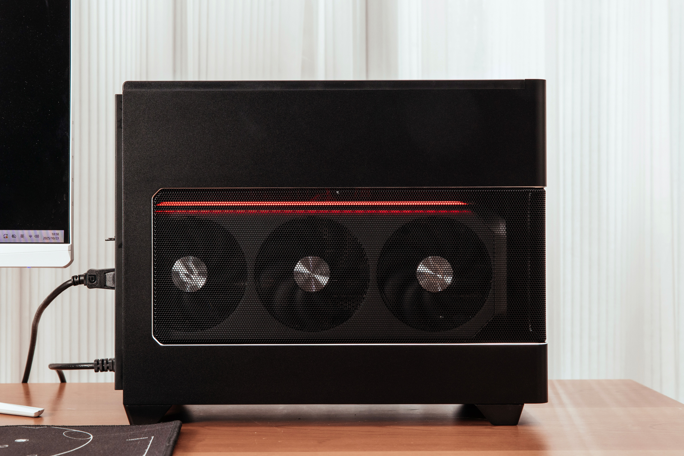 正面,可以看到显卡几乎占据了一半空间,这次开孔为显卡带来了超强的散热表现,作为一款itx机箱显卡温度可以算是比较低的。