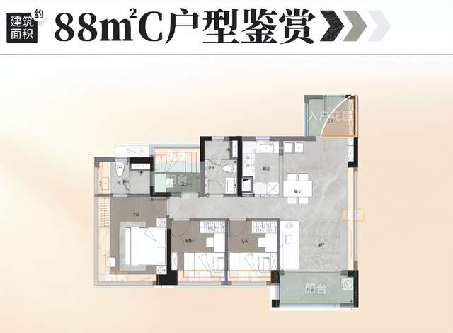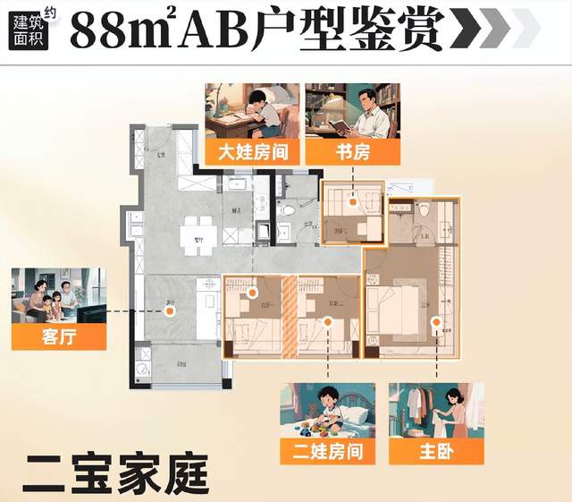 约88㎡户型: 适合二胎家庭。该户型拥有三个卧室,可以满足一家人的居住需求。主卧还带有书房,方便在家办公或学习。