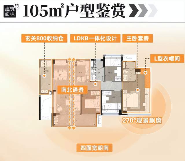 约105㎡户型: 适合改善型家庭。该户型拥有更大的空间,客厅开间可达6米,更加宽敞舒适。南北通透的设计,保证了室内的采光和通风。