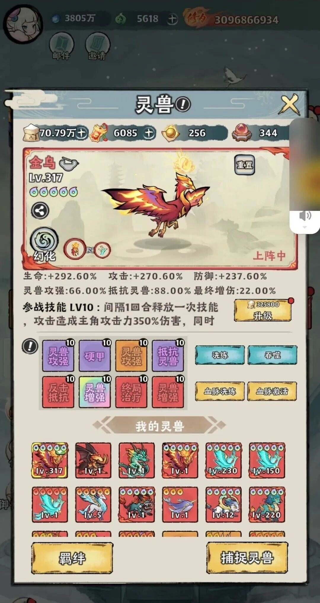进化形态跃迁:当灵兽满足等级、星级及特殊材料要求时,可触发进化机制。进化后不仅外观发生形态跃迁,属性成长率提升 30%,且解锁专属被动技能。