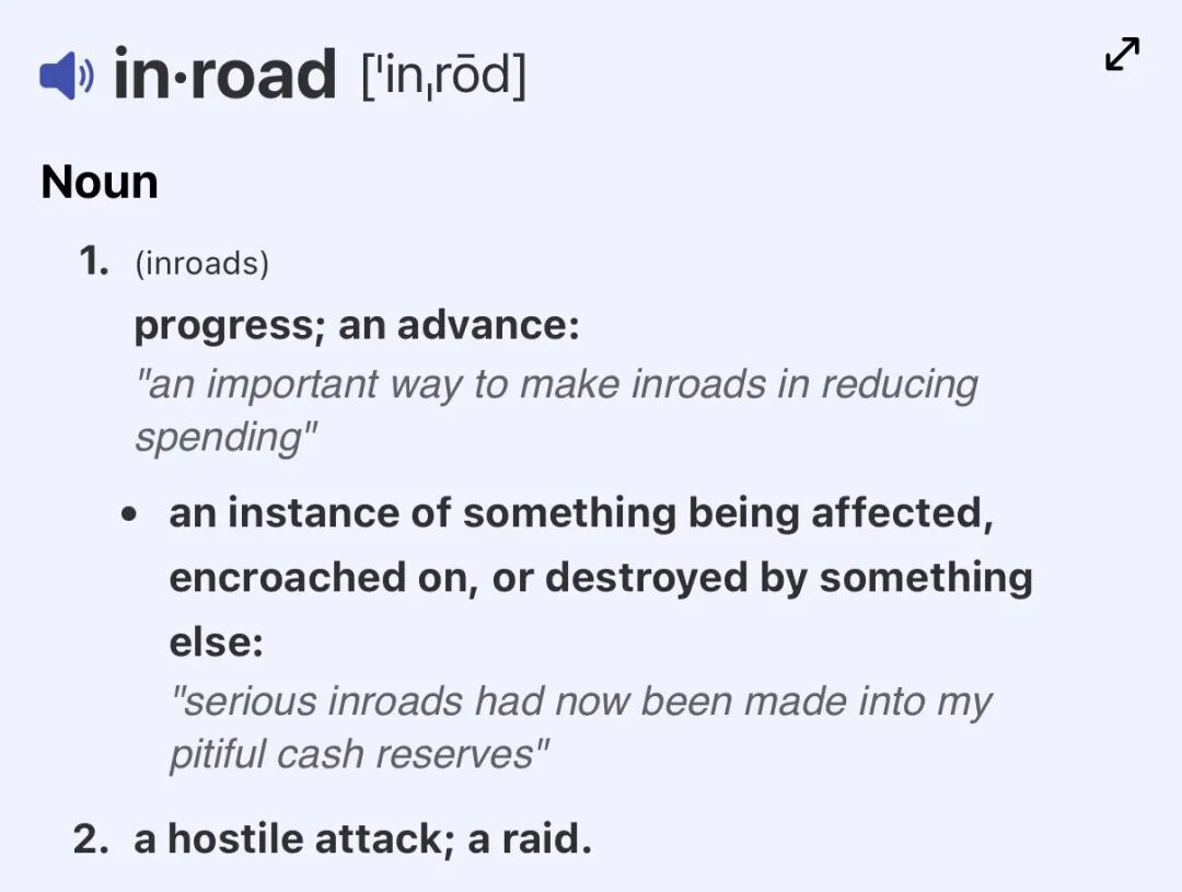 经词义演变后,虽然 inroad 还保留着原来的贬义,但大部分时候,用作褒义。