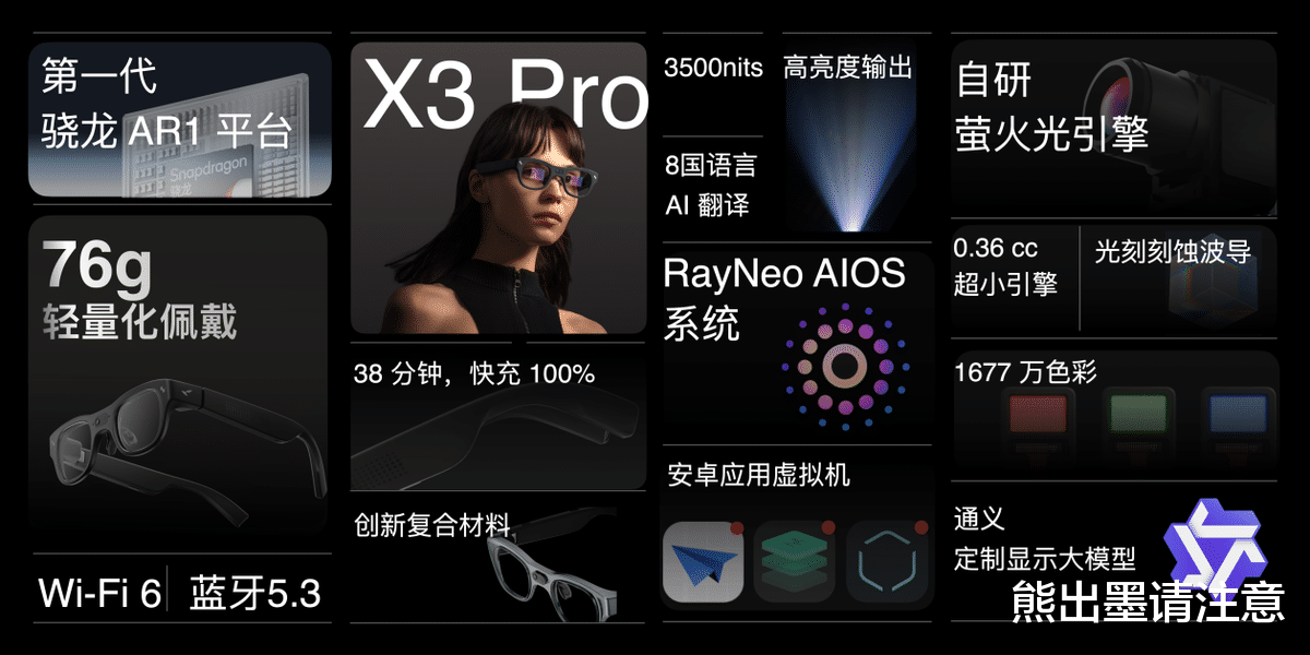 而本次推出的新品,除了Air系列、V3系列这两大热销产品外,更有全彩AI+AR眼镜雷鸟X3 Pro,产品突破芯片、交互、空间计算、重量与光学显示五大核心技术难题,并开创性地引入可视化Live AI和安卓虚拟机,带来全新的眼镜应用生态。