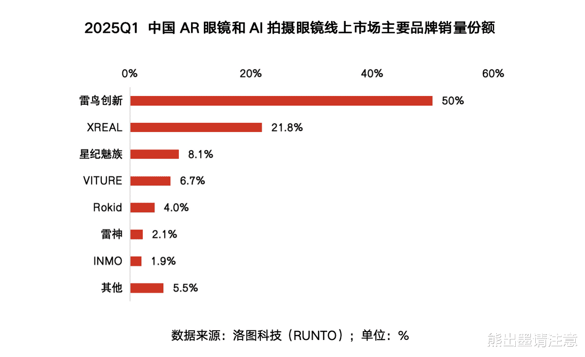 值得一提的是,第三方机构洛图科技Runto最新数据显示,2025年第一季度,雷鸟创新在中国AR/AI拍摄眼镜线上市场以50%的市场份额断崖式领先行业,稳居第一。其中,旗下产品雷鸟V3在AI拍摄眼镜细分市场的占有率高达95%、雷鸟Air 3也已连续20周蝉联该品类销量冠军,持续受到消费者热捧。