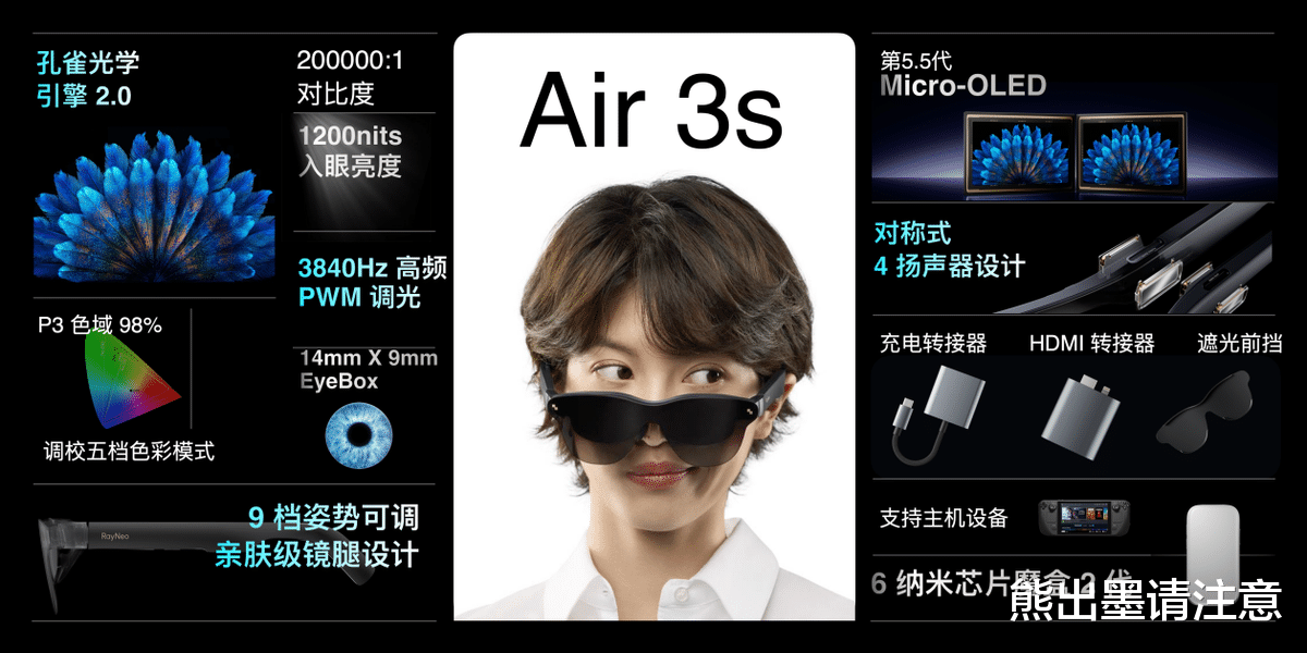 雷鸟Air 3s系列全系采用孔雀光学引擎2.0+第5.5代全新Micro-OLED屏幕,在画质精度、清晰度和亮度上实现三重飞跃,无论是宇宙星空的璀璨还是电影、游戏画面的细腻过渡,都能精准呈现。在延续上一代背靠背四扬声器系统基础上,雷鸟Air 3s Pro更是带来了全新的3D环绕音效系统,能让你听音乐,看电影,玩游戏,都能有极富空间感的环绕表现。