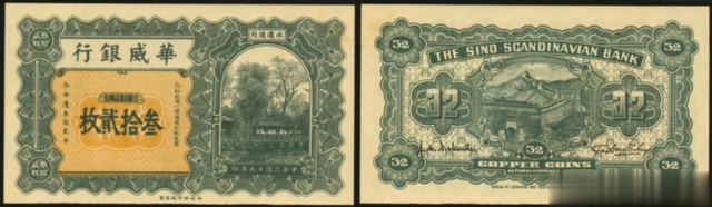 民国十五年(1926年)华威银行当拾铜元叁拾贰枚,永遵通用,为《TOP中国纸币》第162页原物,少见的奇特面额;PMG-64分,纸张硬挺白净,图案细节清晰,色彩浓郁鲜明,状态极佳,价格能到32000左右。