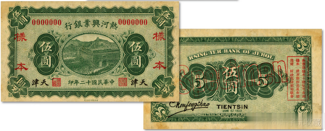 民国十二年(1923年)热河兴业银行伍圆样本,天津地名,楷体“样本”字,单张正背面合印;PMG-63分,为《原色省银行纸币图说》第303页原物,九五成新,价格到25000左右。