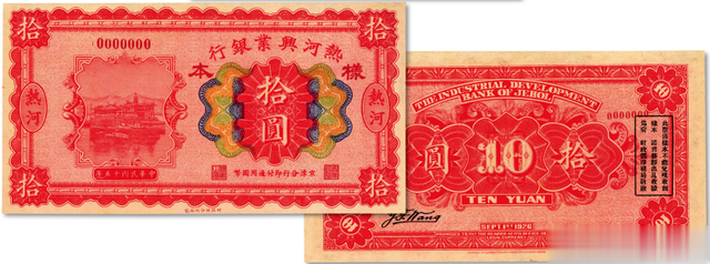 民国十五年(1926年)热河兴业银行拾圆样本,单张正背面合印,热河地名,京津分行即付通用国币,PMG-64分,为《原色省银行纸币图说》第305页原物,凹凸明显,色彩浓郁纯正,全新品相,曾拍出28750元。