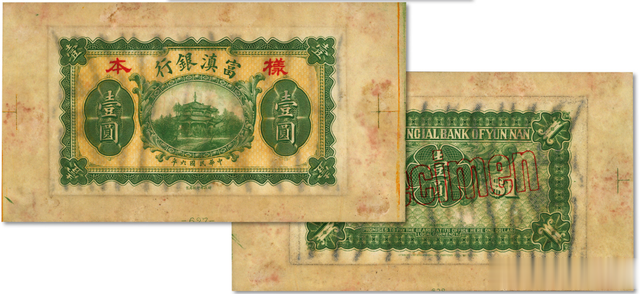 民国六年(1917年)富滇银行财政部版壹圆样本,为中国省钞与云南纸币之大珍品,PMG-53分,为《原色省银行纸币图说》第124页原物,带边纸、未印号码,原味十足,九八成新,曾拍出28750元。