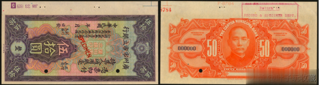 民国年(1929年版)广州市市立银行伍拾圆样本券,单张正背面合印,带边纸,上有版铭及日期,PMG-65EPQ,为《原色省银行纸币图说》第99页原物,全新品相,曾拍出23000元。