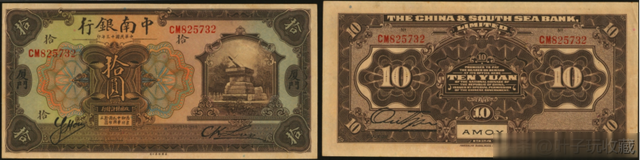 民国十三年(1924年)中南银行拾圆,厦门地名,少见品种,PMG-35分,纹理清晰,凹凸强烈,色彩浓郁,原汁原味,八五成新,价格能到28000左右。