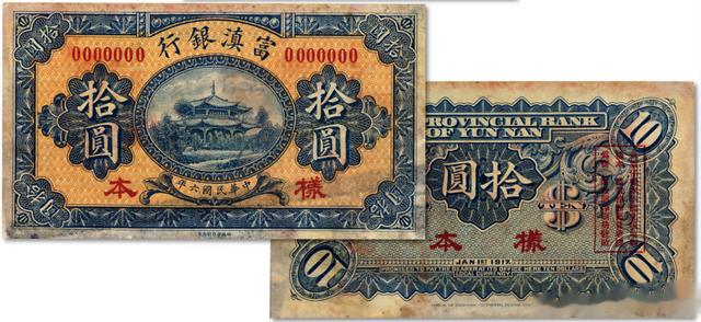 民国六年(1917年)富滇银行财政部版拾圆样本,中国省钞与云南纸币中的大珍品;PMG-53分,为《原色省银行纸币图说》第125页原物,中未折,九五成新,价格能到28000上下。