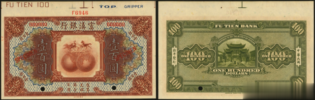 富滇银行无年份美钞版(1921年)壹百圆样本券,带版铭,PMG-66EPQ,为《原色省银行纸币图说》第127页原物,纸张白净,色彩浓郁醇厚,价格能到32000左右。