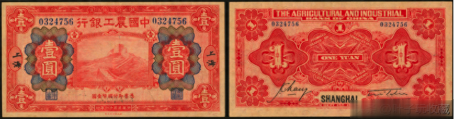 民国十六年(1927年)中国农工银行财政部版淡红色壹圆,上海地名,PMG-55分,为《中国华商纸币图说》第101页原物,凹凸明显,色彩浓郁,醇厚自然,品相一流,九五成新,曾拍出23000元。