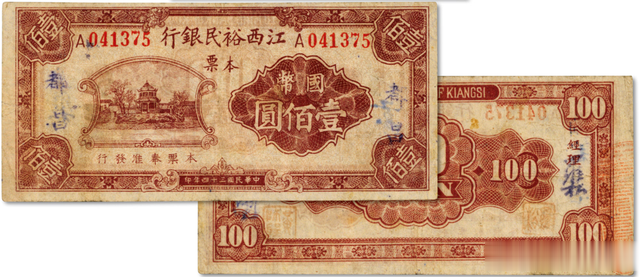 民国三十四年(1945年)江西裕民银行本票·国币壹佰圆,都昌地名,中国省钞及江西纸币之珍罕品;PMG-25分,原汁原味,八成新,曾拍出28750元。