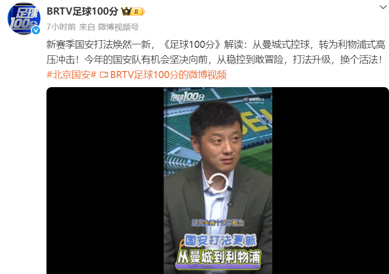 《足球100分》的官微上(上图)写着:从曼城式控球,转为利物浦式高压冲击!今年的国安队有机会坚决向前,从稳控到敢冒险,打法升级,换个活法!