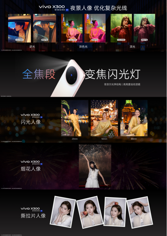 蔡司APO超级长焦采用复消色差光学设计,有效抑制色散,确保长焦端成像锐利纯净。配合全新舞台模式,X300能智能识别演唱会等强光环境,保留人物面部细节与舞台氛围光效;烟花人像模式则可同步捕捉人物表情与烟花轨迹,支持Live动态回放。前置5000万超清镜头支持92度广角自拍,结合NICE大模型与vivo自然美颜算法,前后摄人像风格高度统一。再加上AI电影分镜与“一图多裁”功能,用户可一键生成胶片风三拼或双拼构图,大幅提升社交出片效率。
