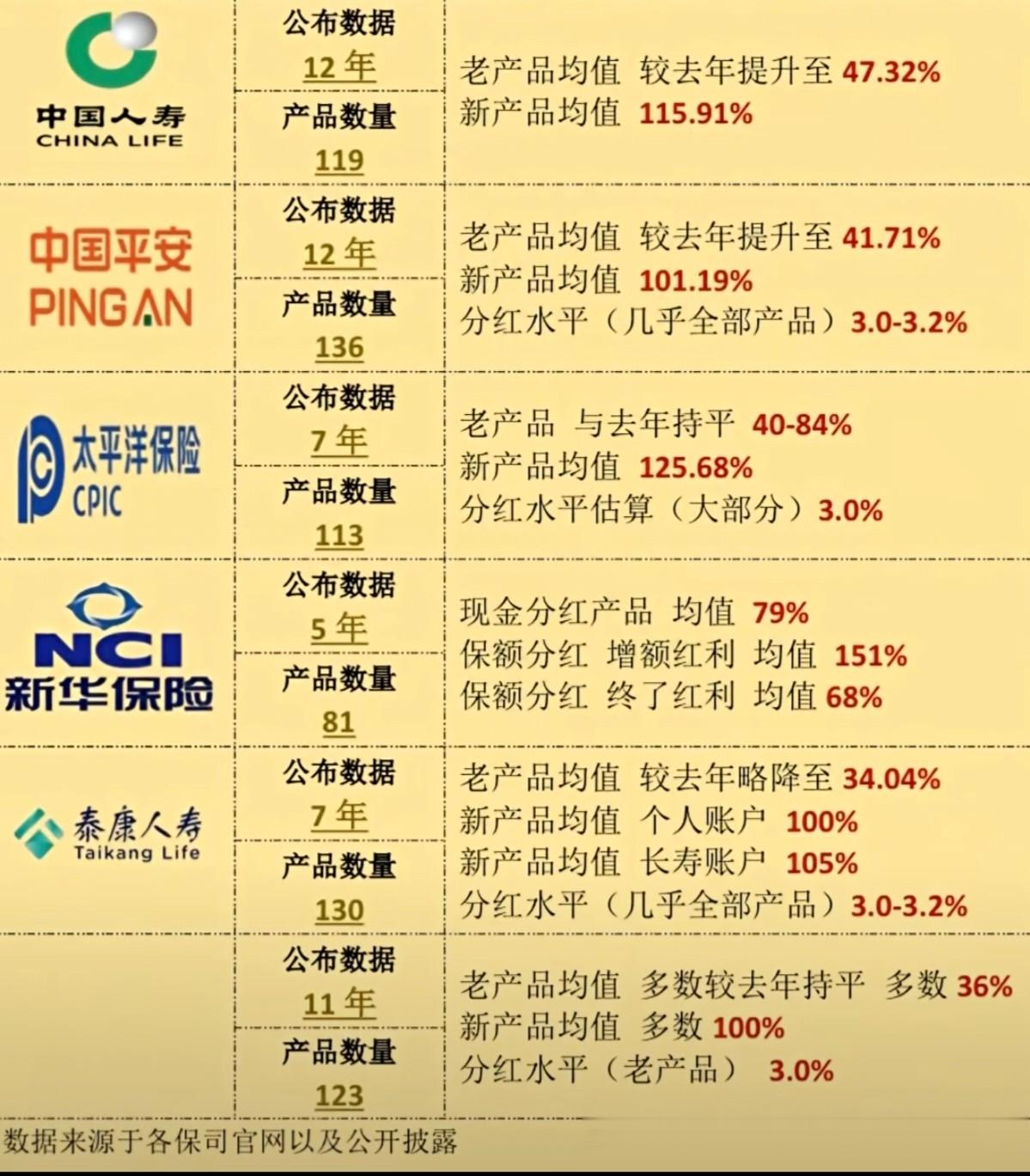 大家可以看到老牌的老六家公司这里有老产品和新产品分红实现率的对比。很明显,老产品实现率低,新产品实现率高。但是新老分红产品的实际收益都在3.1左右。