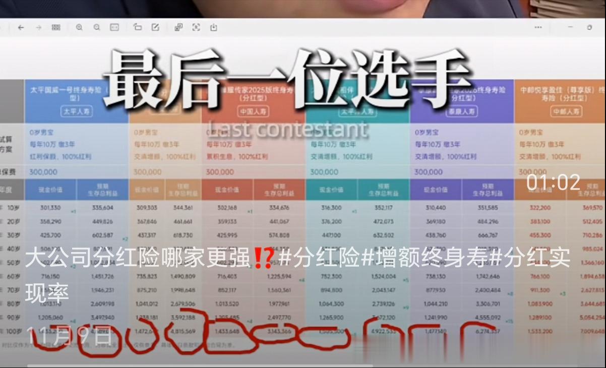 让我怎么说呢?对比实现率也就罢了,那么低级我们就不聊了。可竟然有不止一个视频博主在对比分红演示收益。你要是固收产品,对比也就对比了,可这是分红啊,是浮动结算的。这就好比说两个单位在招人,一个单位说来我这吧,十年以后给你一张大饼。另一个单位说他们那不行,来我这,十年以后给你两张大饼!就是这么个意思。