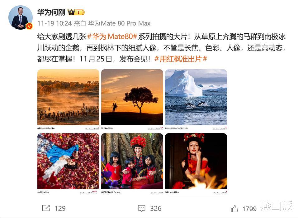 值得注意的是,在该短片发布的第二天,华为就正式发布全新“第二代红枫影像”,并同步释出由华为Mate 80系列拍摄的长焦微距慢动作视频。与此同时,华为终端BG首席执行官 何刚,也在社交平台分享多组新机实拍样张。这一系列高密度、高规格的官方动作,清晰传递出一个信号:华为Mate 80系列或将首发第二代红枫影像,以此实现影像能力的全面跃升,再度夯实其“影像王中王”的行业地位。