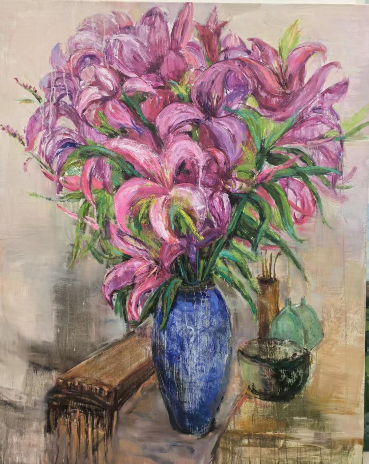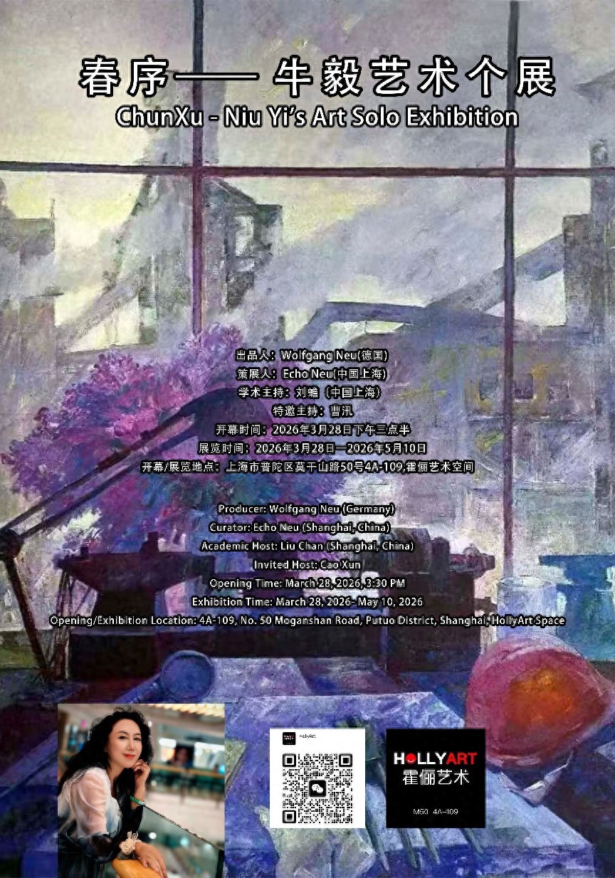 在当代套路模式横行的艺术圈里,再次观看牛毅的作品是有意义的。自然而然的形态、新鲜感性的色彩、朴实无华的主题、粗狂有致的线条,在这个经济环境有点萧条的时代里,显得生机勃勃、希望重生。又仿佛是一股回流,将我们之前对艺术创作最初的理解、想象与期盼又拉了回来,艺术又绽放出她应有的活力、自然与美妙。但牛毅的这些作品又不仅仅是眼睛所看到的那种表面的样式,她们是艺术家牛毅个体生命体验经历的显现。她画的工业厂房,在黑乎乎的一团色彩里,刚劲粗细有致的线条没有弯弯绕绕的变化,却像厂房里工人的肌肉线条一样强劲有力,它像一座纪念碑,把东北的工业之旅和上一辈人艰辛劳作的场景凝固在那里,连同工人曾经锤炼呼喊挥汗如雨的场景一起封尘了起来,但却透着缕缕希望之光,成为我们永恒的记忆,也永远是东北甚至中华民族了不起的工业史。相之于工业风,牛毅其他的作品却又充满了另一番人文情怀和温暖色彩。有一张名叫《 花样年华》的作品描绘了温暖如春绚烂多彩的画室窗外的工业之景,一冷一暖,一刚一柔,把艺术家牛毅的生活经历和内心世界、精神性格描绘得如此精准,两个精神世界被嫁接得如此完好。再看她的风景系列、花卉系列作品,一切都是春天生命的感觉。她把花卉定格为粉紫色和淡绿色,将春天的絮语娓娓道来。她可以将画面处理得铿锵有力,也可以将画面描绘得柔美饱满。在诸多作品里,还有两张关于“佛”的主题的作品,她将之拟人化,一左一右仿佛是一男一女化作人间使者,庇护着我们的精神维度,高大透亮有神,既柔美又有力量。在牛毅的作品里,观者感受到了浓黑色的坚毅、粉紫色的绚烂、青绿色的生机、浅灰色的佛性……有封尘了多年的沧桑历史、又有令人敬畏的闪光精神、也有大自然的深沉宁静之光、更有人文关怀的日常生活之景……牛毅是一个可紧可松、可甜可咸、可忧郁可欢乐、可轻松可深沉的鲜活女子。作为一个艺术家,她所到之处,都会留下活力四射的光芒,可以在田野山脚下,可以在恬静的画室里,可以在欧洲的古堡里,可以在苍茫的大地上、可以在尘封的工厂里,可以在含蓄不可见的精神世界里……她是活跃的、她是灿烂的、她是深沉的、她是内敛的、她更是奔放的……在牛毅的艺术世界里,她刚柔并济、收放自如,就像她这样一个毫不矫饰的女子,在艺术的世界里自由翱翔……2026年的3月里,霍俪艺术空间迎来了“春序——牛毅艺术个展”,跟随着她的创作,去亲闻春一般的馨香……