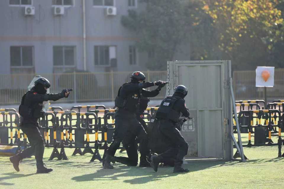 随后进行的汇报展演环节在庄严的升旗仪式中拉开帷幕。石家庄市公安局巡特警支队、治安支队的干警们为现场师生带来了一场震撼人心的特警防暴展演。内容包括特警臂盾实战格斗技能、无人机实战应用、警犬科目、女警应用射击技能以及突击攻坚实战应用等。干警们精湛的技能、默契的配合和昂扬的斗志,充分展示了公安队伍在处置校园突发安全事件、保护师生安全方面的强大能力和坚定决心,赢得了现场阵阵掌声。展演间隙,石家庄市第十八中学啦啦操队带来了充满青春活力的表演,展现了学子们阳光向上、团结友爱的精神风貌,也从侧面体现了健康积极的校园文化对防范欺凌的积极作用。