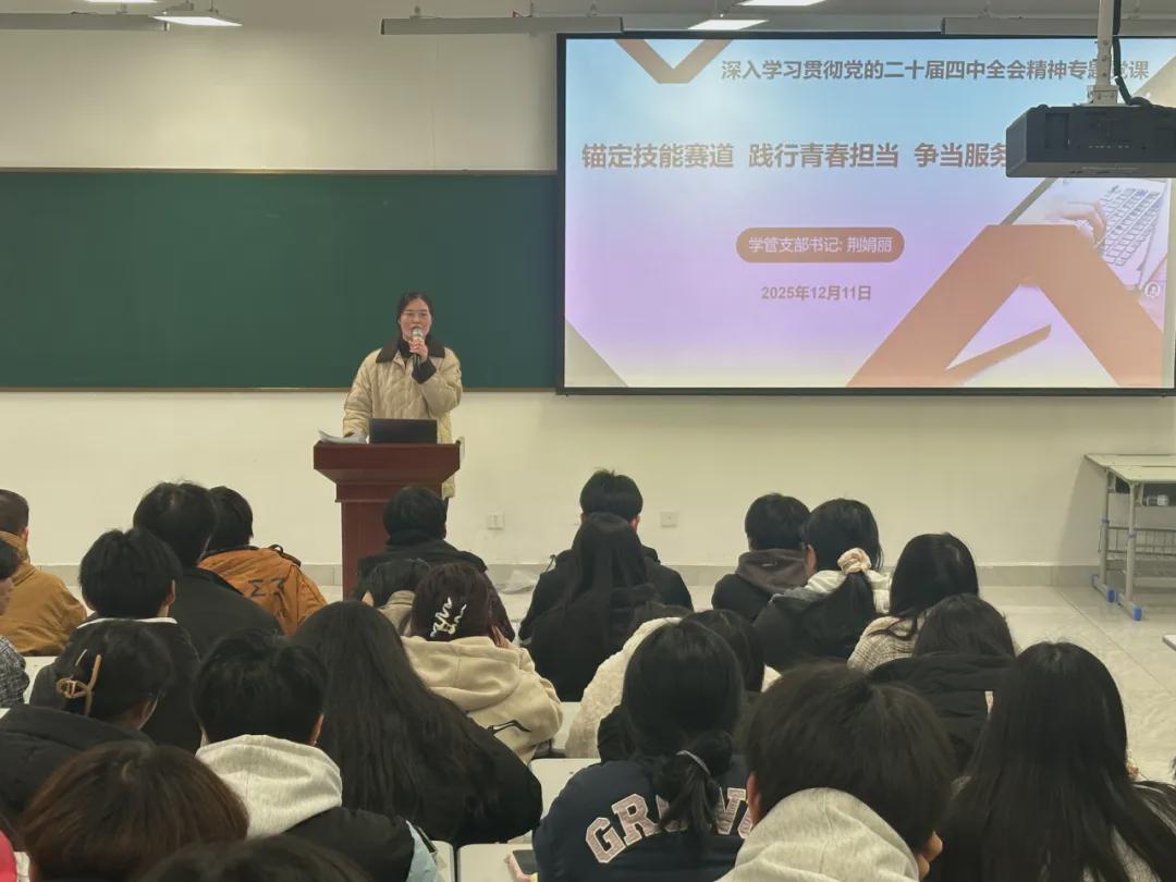 近日,信阳技师学院学管支部紧扣学生工作实际,组织开展了以“技铸青春担当:学全会精神、做服务先锋”为主题的专题党课,创新采用“党员与学生同上一堂课”的形式,推动全会精神直达青年群体,进一步凝聚起师生“学思践悟强信念、立足岗位勇担当”的奋进力量。本次党课由学校学管支部书记荆娟丽同志主讲,学管支部全体党员、学校学生干部参加。