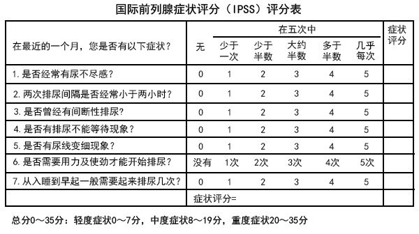 1.国际前列腺症状评分(IPSS):医生可能会让病人通过国际前列腺症状(IPSS)评分表来量化其尿路症状并判断症状的严重程度。