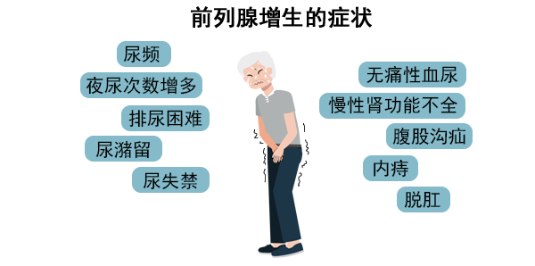前列腺增生的症状一般在40岁以后出现,60岁左右症状更加明显。主要包括:●尿频:常见的早期症状,夜间更为明显。正常人每天排尿5~6次,每次尿量约300毫升,夜间排尿次数不超过2次。每天排尿次数超过8次,而且每次尿量较少即可认为尿频。●排尿困难:症状由轻到重,发展缓慢。可表现为排尿迟缓、断续、尿流细而无力、射程短、终末滴沥、排尿时间延长等。●尿潴留和尿失禁:膀胱不能排空,有残余尿。残余尿逐渐增加,尿液不自主从尿道口溢出,出现充盈性尿失禁。