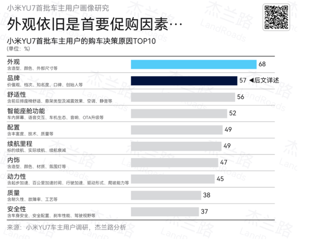 这时候或许有人会反驳,小米汽车打着 “ 高性能 ”、“ 速度 ”、“ 跑赛道 ” 的旗号,不是卖得风生水起吗。但是从调研机构杰兰路发布的小米 SU7 意向用户画像、小米 YU7 首批用户画像研究来看,“ 动力 ” 这一卖点并不属于小米用户的主要购车决策因素,只排在了第 6 位,大家更注重的依然是智能座舱、智驾以及外观。