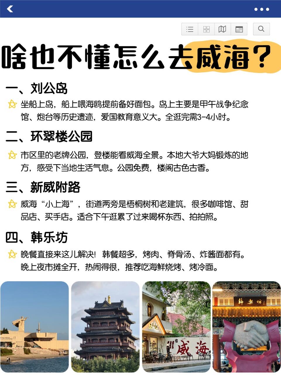 第四天:刘公岛坐船记得带面包喂海鸥!岛上主要是历史遗迹。环翠楼公园免费,能看全市景。下午去新威附路,威海“小上海”,逛拍歇脚。晚上去韩乐坊夜市,人巨多但吃的也巨多!