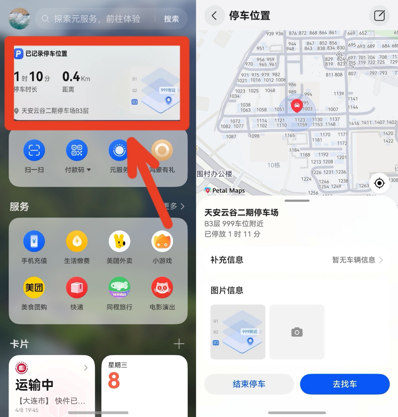 这次又出差,我本来还在担心老问题,但是没想到新换的Mate80手机帮了大忙,鸿蒙系统自带的花瓣地图地库寻车功能真的太好用了。停车熄火、锁车之后,在桌面右滑打开负一屏,一张停车卡片已经自动生成。上面清晰标注了停车的楼层,车位信息一目了然,完全不用自己手动拍照记录了。