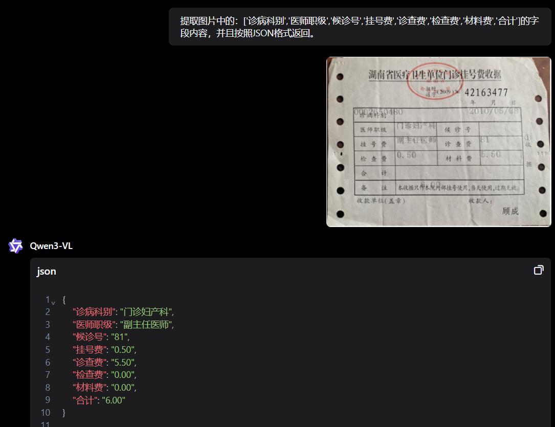 例如,官方Demo中,这张实拍的挂号费收据字迹模糊,还有重叠,肉眼看着都有些费劲。但模型能准确识别字样,并根据指定格式输出。