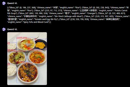 Qwen3-VL也具备识别万物的能力,名人、美食、动植物、汽车品牌、动漫角色等均在其知识储备范围内。上传一张图片,模型就能准确报菜名,还是带定位框的那种。