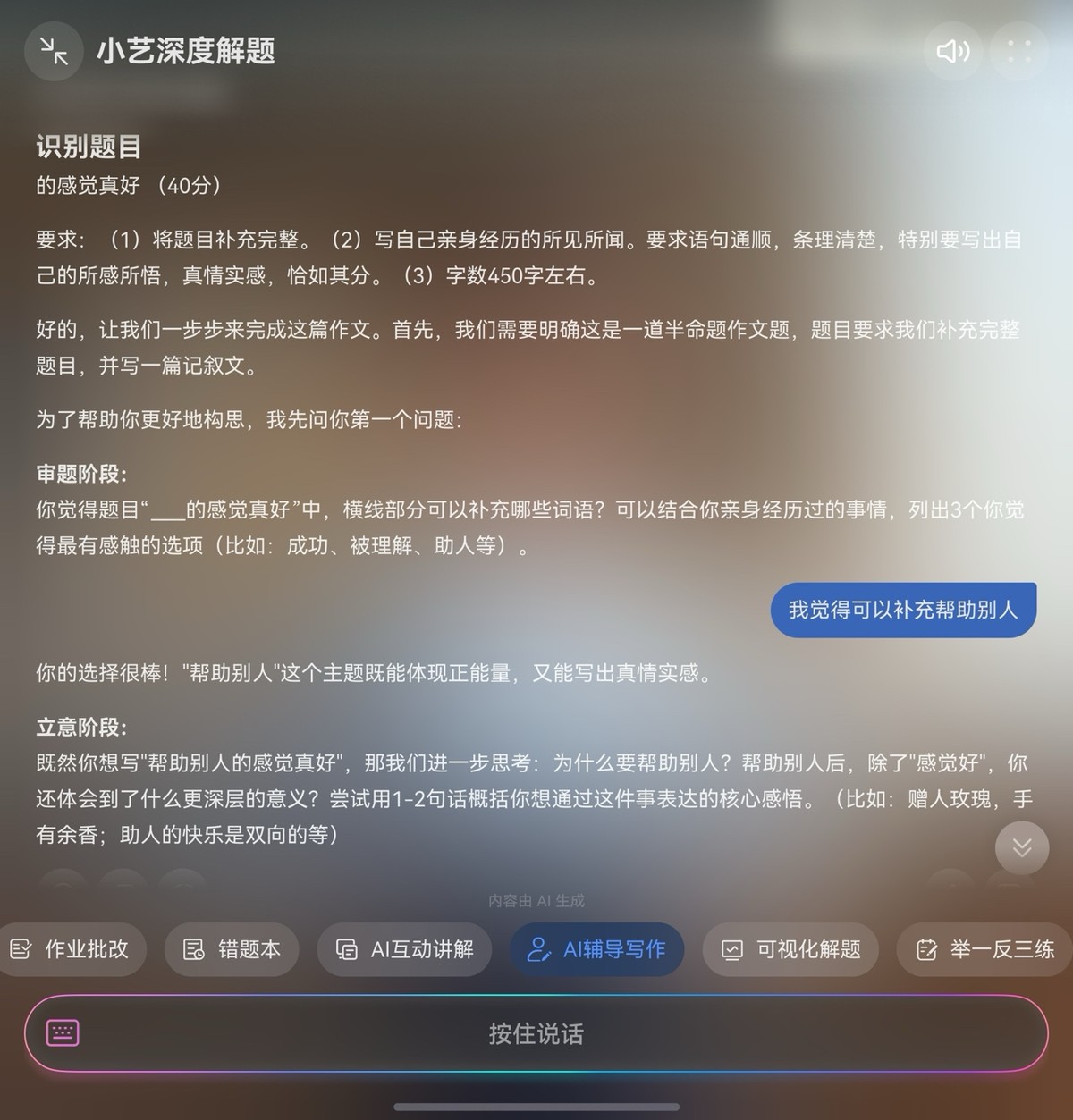 顺着这些问题,孩子的思路慢慢打开,开始滔滔不绝地和小艺对话,讲自己的想法。这种沉浸式的互动引导,让孩子在思考中摸清了写作逻辑,这可比单纯看范文管用多了。