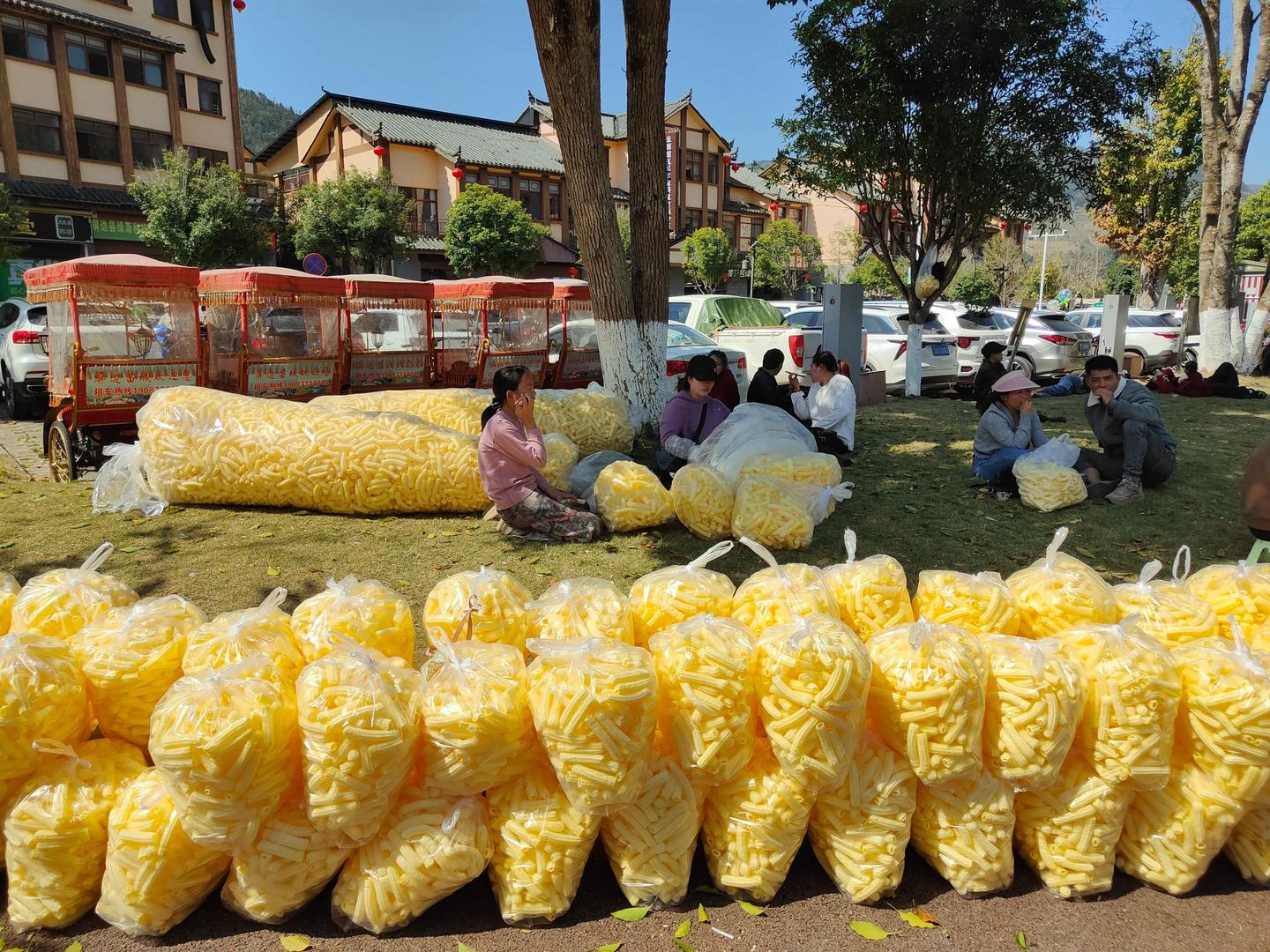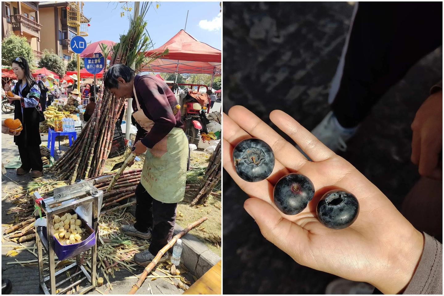 吃的要不少,下图这个,我们珠三角中年都叫他米通,但是你说叠成这样卖的话,还是第一次见到。而甘蔗的话,削皮卖见的多,砍成一小块一小块的,在云南才见得多。在这里,蓝莓也终于有点自由的感觉了,应该都超20mm的果子,25元一斤,花香气味够。